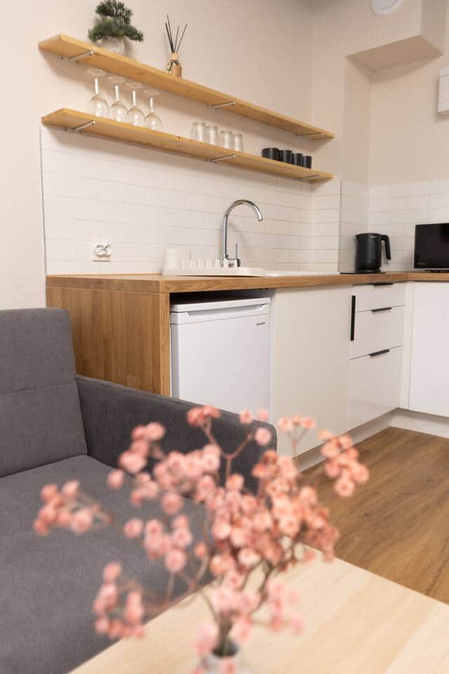 Coffee machine, Cooking utensils, Kitchenette, Microwave, Refrigerator