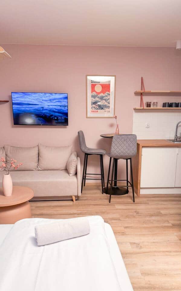 Przytulne, nowe mieszkanie w dobrej lokalizacji. Zapraszamy do Pink Studio – nowoczesnego i stylowo urządzonego apartamentu w Warszawie. Mieszkanie jest funkcjonalne, a jego lokalizacja czyni je świetną bazą wypadową – znajduje się zaledwie 1 km od lotniska Chopina, w pobliżu centrum handlowego Blue City (4,8 km), Dworca Zachodniego (5,1 km), Dworca Centralnego i Złotych Tarasów (5,9 km) oraz Muzeum Powstania Warszawskiego (6,1 km). Jest to apartament typu studio w którym znajduje się wygodne łóżko małżeńskie typu king size oraz kanapa z funkcją spania dla dwóch osób. Kuchnia jest w pełni wyposażona – znajdziesz tu lodówkę, płytę grzewczą, mikrofalówkę, ekspres do kawy i czajnik elektryczny, a także komplet naczyń, przyborów kuchennych oraz wszystko, co niezbędne do przygotowania posiłków.